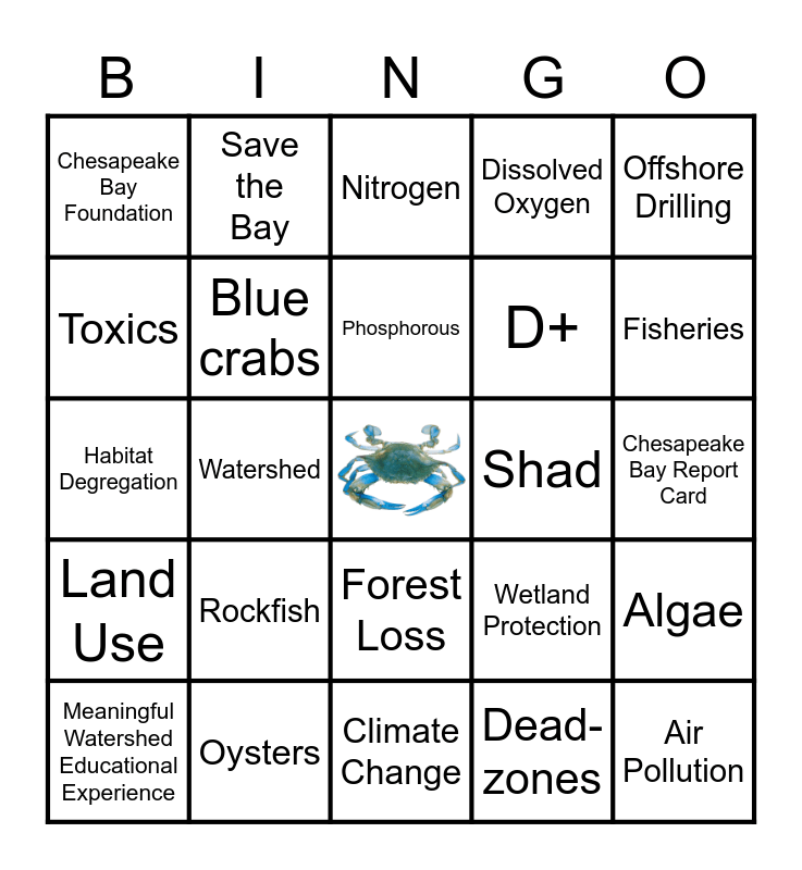 This bingo card has a free space and 29 words: Meaningful Watershed Educational Experience, Chesapeake Bay, Watershed, Environmental interactions, Chesapeake Bay Foundation, Nitrogen, Blue crabs, Rockfish, Shad, Oysters, Chesapeake Bay Report Card, Air Pollution, Climate Change, Dead-zones, Fisheries, Polluted Runoff, Forest Loss, Land Use, Offshore Drilling, Habitat Degregation, Wetland Protection, Water Use, D+, Toxics, Dissolved Oxygen, Save the Bay, Algae, Phosphorous and Chemical Contamination.