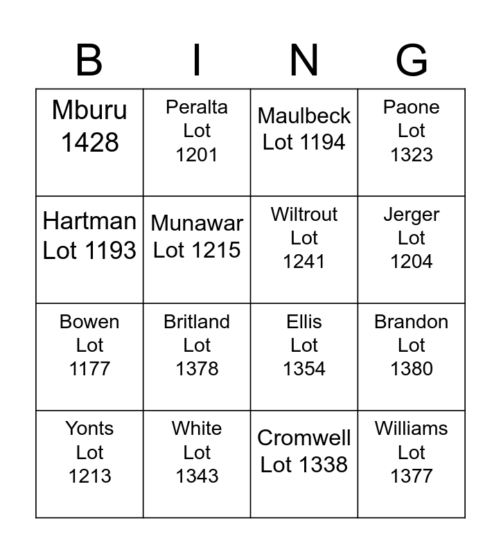 This bingo card has 16 words: White Lot 1343, Brandon Lot 1380, Maulbeck Lot 1194, Mburu 1428, Bowen Lot 1177, Peralta Lot 1201, Ellis Lot 1354, Cromwell Lot 1338, Hartman Lot 1193, Munawar Lot 1215, Yonts Lot 1213, Paone Lot 1323, Britland Lot 1378, Jerger Lot 1204, Wiltrout Lot 1241 and Williams Lot 1377.