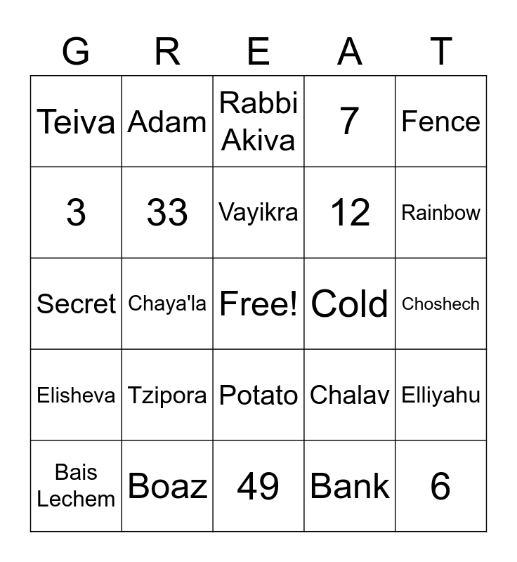 This bingo card has a free space and 34 words: Age, Bank, Promise, Echo, Elisheva, 33, Fence, Bais Lechem, Adam, Stamp, Vayikra, Rabbi Akiva, Rus, Zevulun, Cold, Rainbow, Boaz, Secret, Tzipora, Chalav, Potato, Sinai, Teiva, Choshech, 49, 6, 7, 8, 12, 3, Rabbi Shimon Bar Yochai, Chaya'la, Elliyahu and Menachem Bentzion.