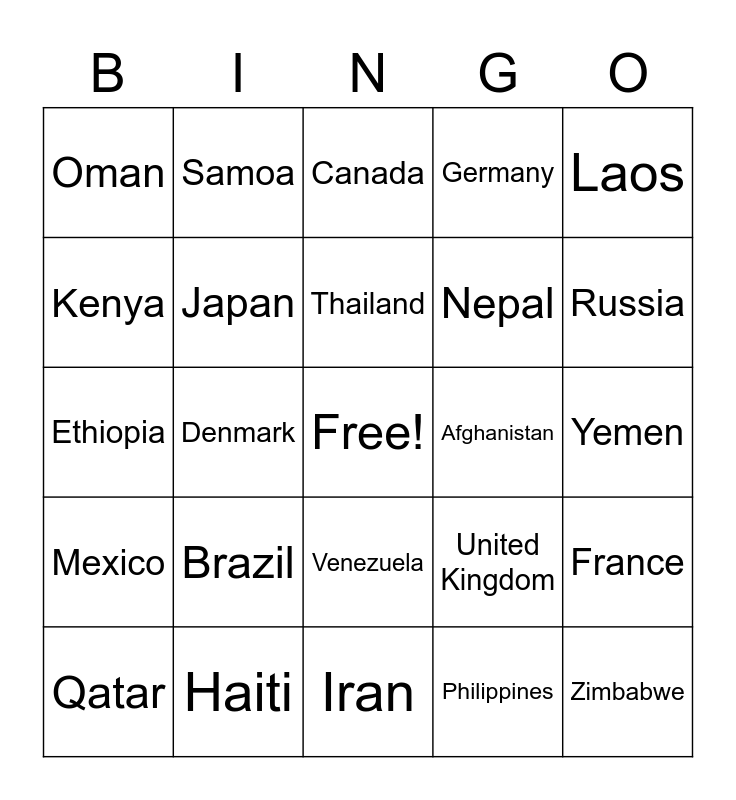 This bingo card has a free space and 24 words: Brazil, Haiti, Thailand, Qatar, Laos, Oman, Kenya, Samoa, Afghanistan, Venezuela, Nepal, Ethiopia, United Kingdom, France, Japan, Philippines, Yemen, Canada, Russia, Denmark, Zimbabwe, Mexico, Germany and Iran.