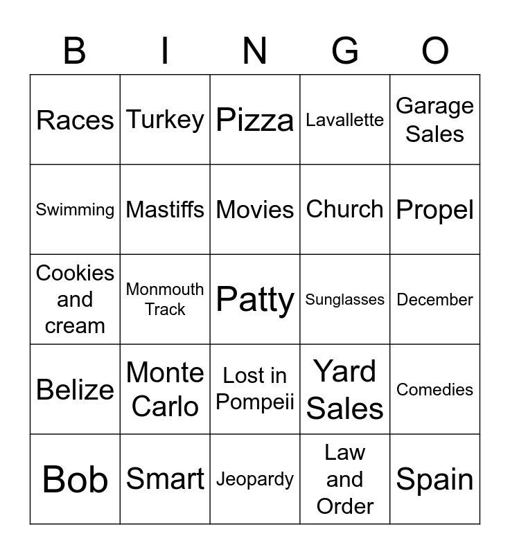 This bingo card has a free space and 100 words: Sixty, Birthday, December, Third, 1961, Party, Daughter, Sister, Niece, Godmother, AGT Judge, Fun, Funny, Smart, Don’t call me cake, Don’t call me PC, Church, Board games, Card games, Solitaire Golf, iPad, Manicures, Pedicures, Fancy Fingernails, Glasses, Sunglasses, Garage Sales, Yard Sales, Bargain Shopping, Walking, Monmouth Track, Races, Television, Perry Mason, Law and Order, Movies, Comedies, Popcorn, Twizzlers, M&Ms, Ice cream, Oreos, Cookies and cream, Diet Coke, Propel, Pizza, Scratch Offs, Lottery Tickets, Trivia, Jeopardy, Spring Flowers, AAA, Training Manager, Affinity Credit Union, Training Specialist, Midatlantic Bank, Head Teller, Jersey Girl, Bricktown, Lavallette, Pittstown, Morristown, Morris Plains, Toms River, Lakewood, Leisure Park, England, Ireland, Kissed the Blarney Stone, Scotland, Wales, Monte Carlo, Florida, Sunbathing, Beaches, Sweetberries, Sunshine, Swimming, Swimming Pool, Plays, Shows, Spain, Italy, Lost in Pompeii, Greece, Turkey, Bahamas, Swam with Dolphins, Mexico, Belize, Guatemala, Cruises, Cruise wear, Bob, Mastiffs, Bronson, Barnaby, Grace, Boardwalks and Retired.