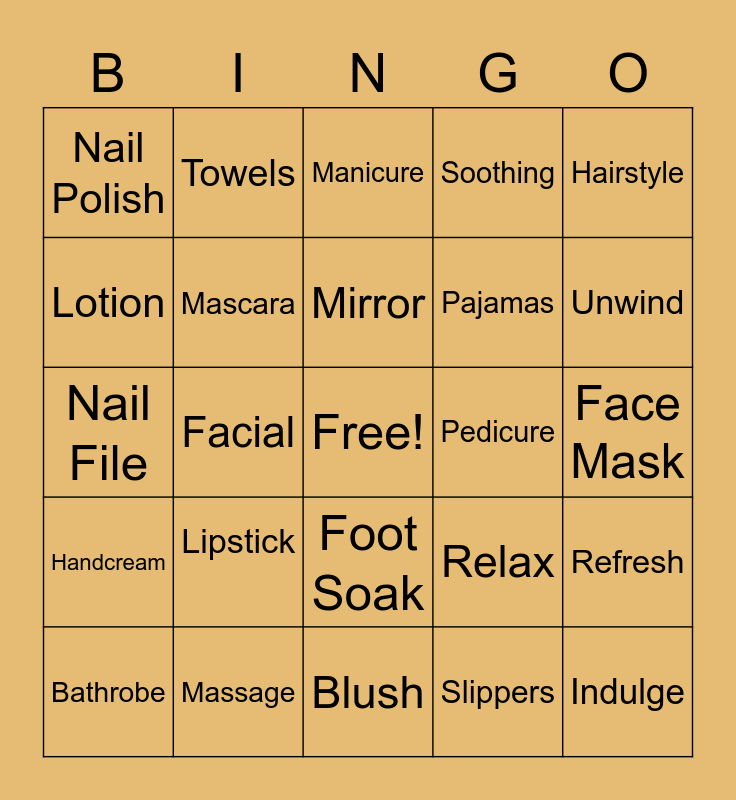 This bingo card has a free space and 24 words: Lipstick, Massage, Mirror, Bathrobe, Hairstyle, Nail Polish, Lotion, Towels, Pedicure, Foot Soak, Pajamas, Nail File, Relax, Refresh, Mascara, Slippers, Face Mask, Manicure, Unwind, Facial, Indulge, Handcream, Soothing and Blush.