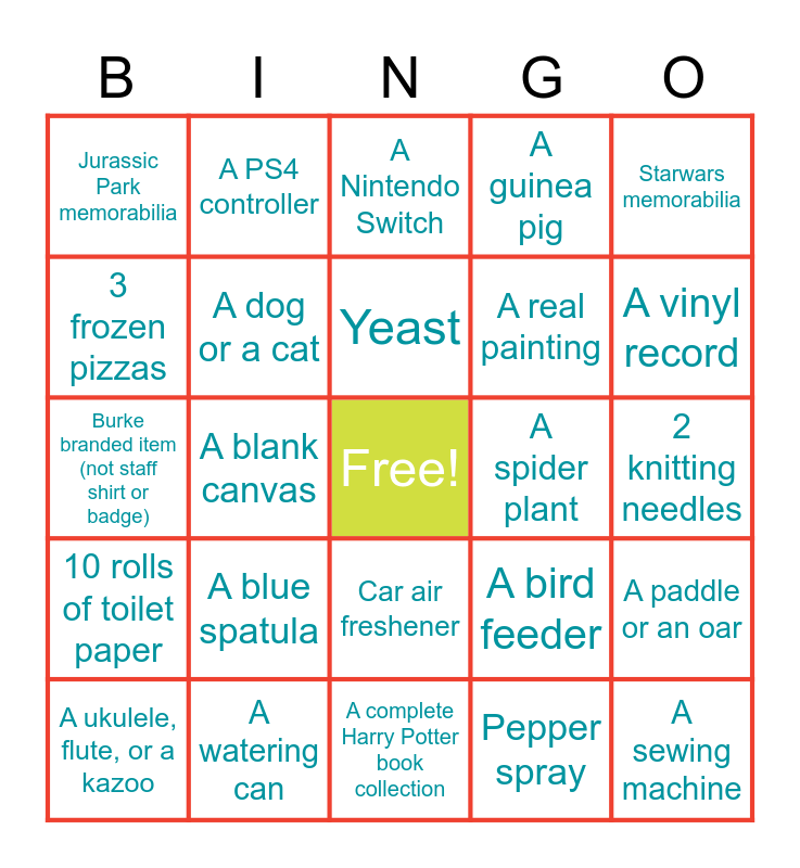 This bingo card has a free space and 24 words: A blue spatula, A watering can, Yeast, A ukulele, flute, or a kazoo, Starwars memorabilia, Jurassic Park memorabilia, 3 frozen pizzas, A PS4 controller, A spider plant, Car air freshener, A real painting, Burke branded item (not staff shirt or badge), A bird feeder, A paddle or an oar, A dog or a cat, Pepper spray, 2 knitting needles, A Nintendo Switch, A vinyl record, A blank canvas, A sewing machine, 10 rolls of toilet paper, A guinea pig and A complete Harry Potter book collection.
