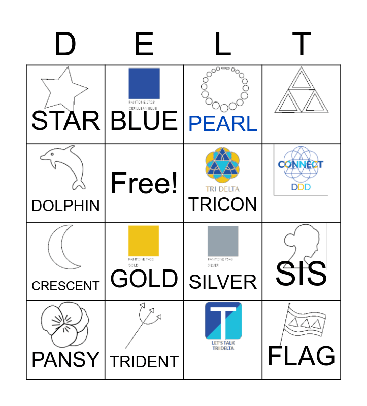 This bingo card has 19 images and 16 words: SIS, BADGE, PEARL, PINE, PANSY, DOLPHIN, TRIDENT, STAR, CRESCENT, BLUE, GOLD, SILVER, Free!, FLAG, TRICON and PARK ST. CHURCH.
