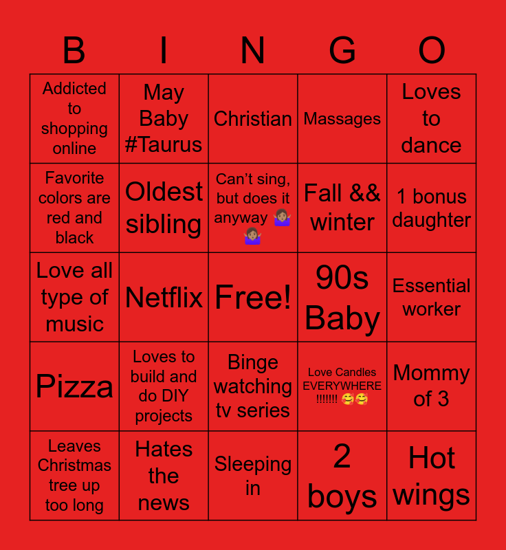 This bingo card has a free space and 24 words: Loves to build and do DIY projects, Hates the news, Canβt sing, but does it anyway π€·π½ββοΈπ€·π½ββοΈ, Leaves Christmas tree up too long, Loves to dance, Addicted to shopping online, Favorite colors are red and black, May Baby #Taurus, 90s Baby, Binge watching tv series, Fall && winter, Love all type of music, Love Candles EVERYWHERE !!!!!!! π₯°π₯°, Mommy of 3, Oldest sibling, 2 boys, Essential worker, Christian, 1 bonus daughter, Netflix, Hot wings, Pizza, Massages and Sleeping in.