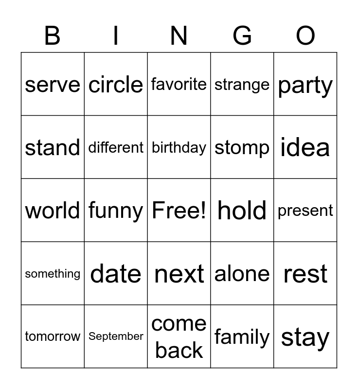 This bingo card has a free space and 24 words: date, September, birthday, tomorrow, party, serve, stand, circle, hold, next, stomp, world, alone, rest, different, family, present, favorite, idea, funny, stay, something, strange and come back.