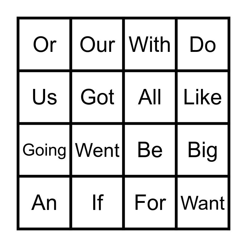 This bingo card has 16 words: If, Big, With, Or, Going, Our, Be, For, Us, Got, An, Do, Went, Like, All and Want.