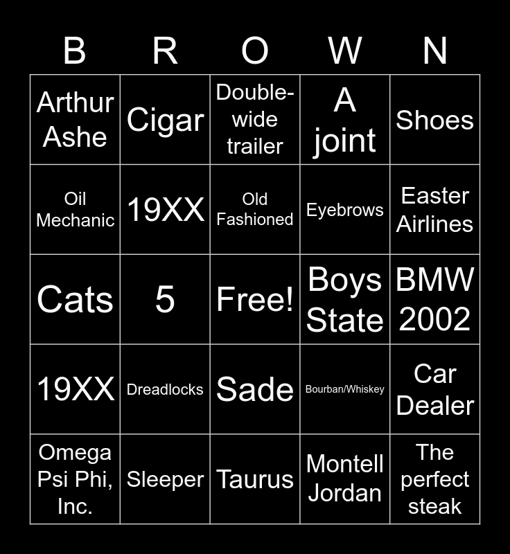 This bingo card has a free space and 38 words: Dope/Word, PB & J, Green, 19XX, Car Dealer, Dreadlocks, Old Fashioned, 0, Shoes, Eyebrows, 5, A joint, The perfect steak, BMW 2002, Oil Mechanic, 19XX, Tornado, Double-wide trailer, Porsche 911 Turbo, Boys State, Arthur Ashe, Sleeper, Easter Airlines, Omega Psi Phi, Inc., Mama’s Boy, Taurus, Latta, 40+, 2+, Toothpaste, 19+, Sade, Montell Jordan, Cigar, Wedding Officiant, Bourban/Whiskey, Cats and Juicy.