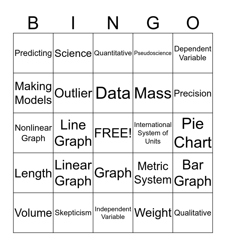 This bingo card has a free space and 24 words: Linear Graph, Skepticism, Data, Volume, Dependent Variable, Predicting, Making Models, Science, International System of Units, Graph, Mass, Nonlinear Graph, Metric System, Bar Graph, Outlier, Weight, Pie Chart, Quantitative, Precision, Line Graph, Qualitative, Length, Pseudoscience and Independent Variable.