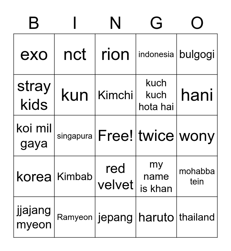This bingo card has a free space and 24 words: Kimbab, Ramyeon, Kimchi, jjajang myeon, bulgogi, exo, stray kids, nct, twice, red velvet, kuch kuch hota hai, koi mil gaya, my name is khan, mohabba tein, kun, haruto, wony, rion, hani, singapura, thailand, korea, indonesia and jepang.