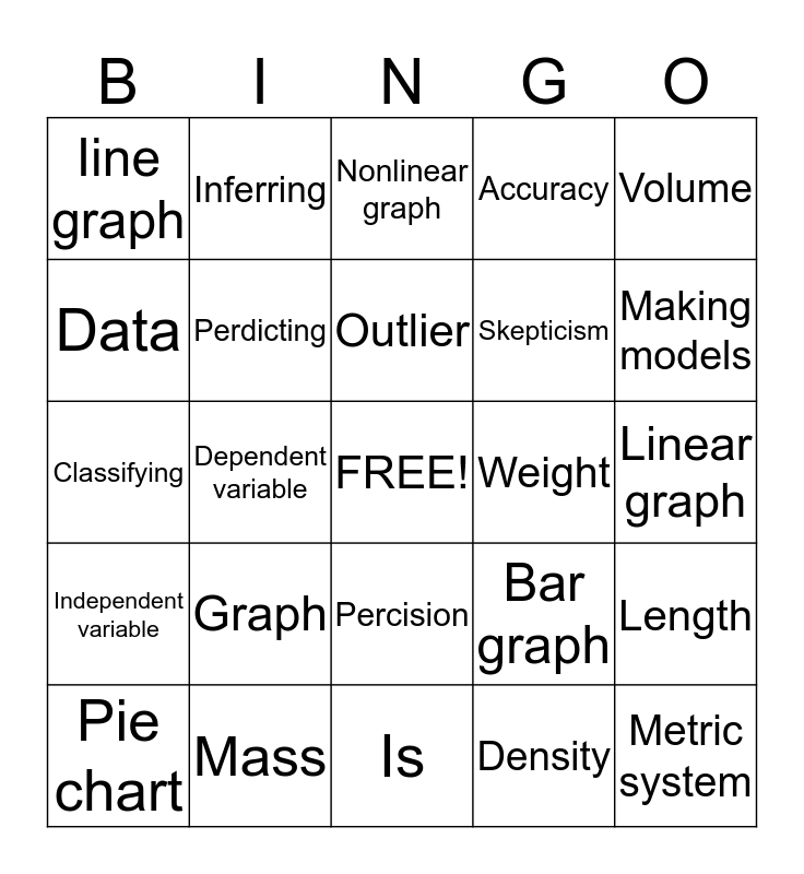 This bingo card has a free space and 24 words: Graph, Mass, Outlier, Pie chart, Volume, Iine graph, Data, Inferring, Weight, Percision, Skepticism, Classifying, Bar graph, Length, Perdicting, Density, Linear graph, Nonlinear graph, Making models, Dependent variable, Metric system, Independent variable, Accuracy and Is.