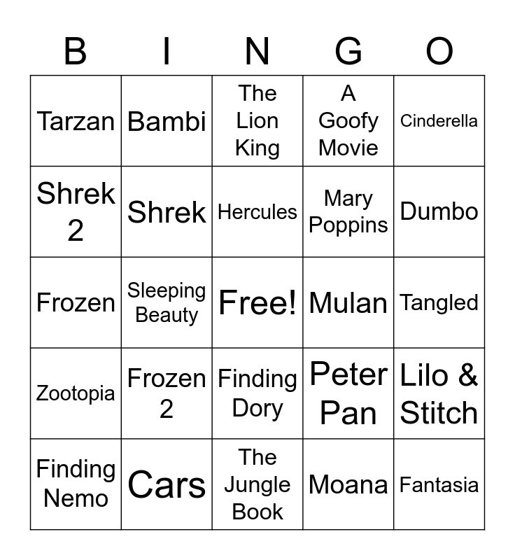This bingo card has a free space and 34 words: Up, Moana, Monsters Inc, Toy Story 3, Zootopia, Shrek, Cinderella, Finding Nemo, Bambi, The Lorax, Hercules, The Lion King, Oliver & Company, Inside Out, Mulan, Dumbo, Cars, Frozen, Frozen 2, Peter Pan, Finding Dory, Pinocchio, Tarzan, Tangled, The Jungle Book, Fantasia, A Goofy Movie, Big Hero 6, Mary Poppins, Shrek 2, Happy Feet, Sleeping Beauty, Lilo & Stitch and Toy Story.