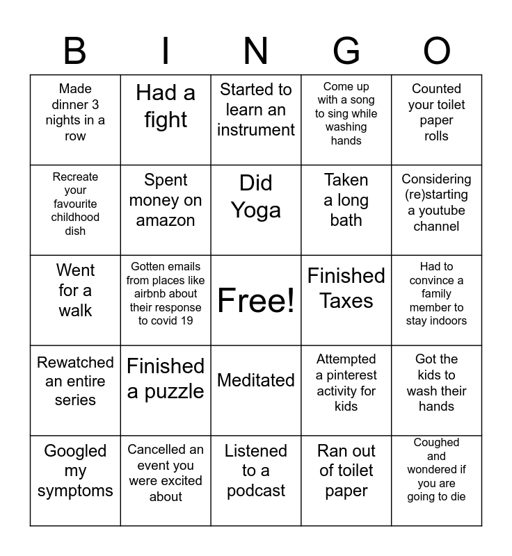 This bingo card has a free space and 25 words: Finished a puzzle, Listened to a podcast, Did Yoga, Googled my symptoms, Counted your toilet paper rolls, Made dinner 3 nights in a row, Recreate your favourite childhood dish, Had a fight, Finished Taxes, Meditated, Taken a long bath, Went for a walk, Attempted a pinterest activity for kids, Got the kids to wash their hands, Spent money on amazon, Tried to learn tiktok dance, Had to convince a family member to stay indoors, Started to learn an instrument, Considering (re)starting a youtube channel, Gotten emails from places like airbnb about their response to covid 19, Coughed and wondered if you are going to die, Cancelled an event you were excited about, Rewatched an entire series, Come up with a song to sing while washing hands and Ran out of toilet paper.