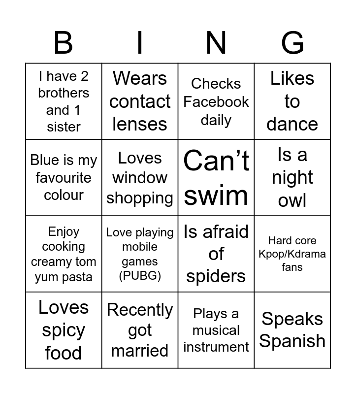 This bingo card has 16 words: Recently got married, Hard core Kpop/Kdrama fans, Checks Facebook daily, I have 2 brothers and 1 sister, Enjoy cooking creamy tom yum pasta, Wears contact lenses, Is afraid of spiders, Plays a musical instrument, Blue is my favourite colour, Loves window shopping, Loves spicy food, Likes to dance, Love playing mobile games (PUBG), Is a night owl, Can’t swim and Speaks Spanish.