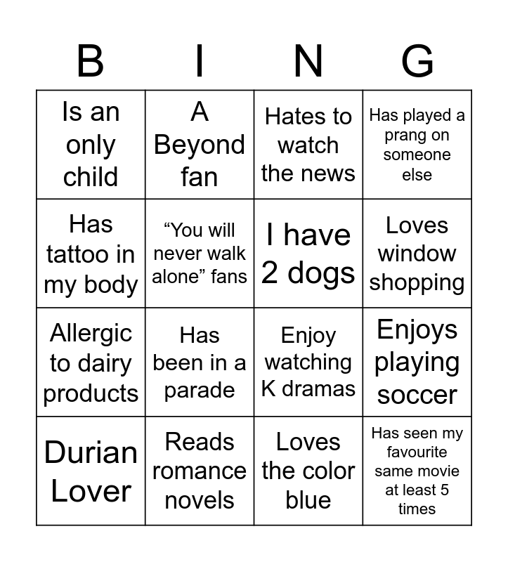 This bingo card has 16 words: Reads romance novels, Enjoys playing soccer, Hates to watch the news, Is an only child, Allergic to dairy products, A Beyond fan, Enjoy watching K dramas, Loves the color blue, Has tattoo in my body, “You will never walk alone” fans, Durian Lover, Has played a prang on someone else, Has been in a parade, Loves window shopping, I have 2 dogs and Has seen my favourite same movie at least 5 times.