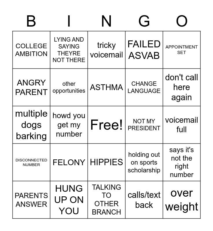 This bingo card has a free space and 24 words: FELONY, HUNG UP ON YOU, ASTHMA, PARENTS ANSWER, APPOINTMENT SET, COLLEGE AMBITION, ANGRY PARENT, LYING AND SAYING THEYRE NOT THERE, NOT MY PRESIDENT, HIPPIES, CHANGE LANGUAGE, multiple dogs barking, holding out on sports scholarship, says it's not the right number, other opportunities, calls/text back, voicemail full, tricky voicemail, don't call here again, howd you get my number, over weight, DISCONNECTED NUMBER, FAILED ASVAB and TALKING TO OTHER BRANCH.