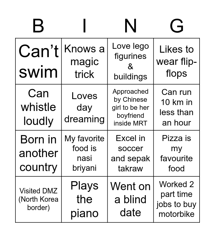This bingo card has 16 words: Plays the piano, Pizza is my favourite food, Love lego figurines & buildings, Can’t swim, Born in another country, Knows a magic trick, Excel in soccer and sepak takraw, Went on a blind date, Can whistle loudly, Loves day dreaming, Visited DMZ (North Korea border), Likes to wear flip-flops, My favorite food is nasi briyani, Can run 10 km in less than an hour, Approached by Chinese girl to be her boyfriend inside MRT and Worked 2 part time jobs to buy motorbike.