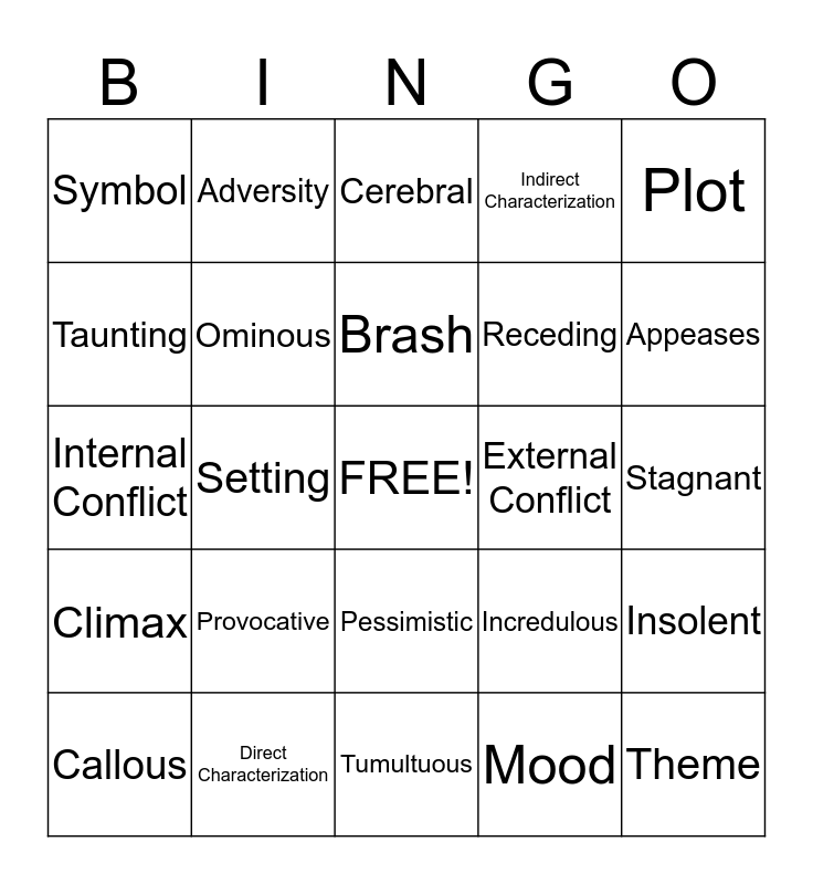 This bingo card has a free space and 24 words: Provocative, Direct Characterization, Brash, Callous, Plot, Symbol, Taunting, Adversity, External Conflict, Pessimistic, Receding, Internal Conflict, Incredulous, Insolent, Ominous, Mood, Stagnant, Cerebral, Appeases, Setting, Theme, Climax, Indirect Characterization and Tumultuous.