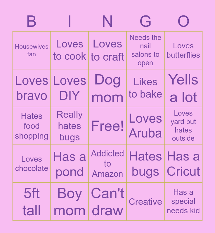 This bingo card has a free space and 24 words: Has a pond, Boy mom, Dog mom, 5ft tall, Loves butterflies, Housewives fan, Loves bravo, Loves to cook, Loves Aruba, Addicted to Amazon, Likes to bake, Hates food shopping, Hates bugs, Has a Cricut, Loves DIY, Creative, Loves yard but hates outside, Loves to craft, Yells a lot, Really hates bugs, Has a special needs kid, Loves chocolate, Needs the nail salons to open and Can't draw.