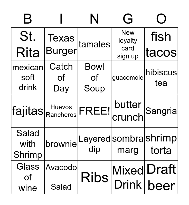 This bingo card has a free space and 24 words: brownie, Avacodo Salad, Bowl of Soup, Glass of wine, fish tacos, St. Rita, mexican soft drink, Texas Burger, butter crunch, Layered dip, guacomole, fajitas, sombra marg, shrimp torta, Catch of Day, Mixed Drink, Sangria, tamales, hibiscus tea, Huevos Rancheros, Draft beer, Salad with Shrimp, New loyalty card sign up and Ribs.