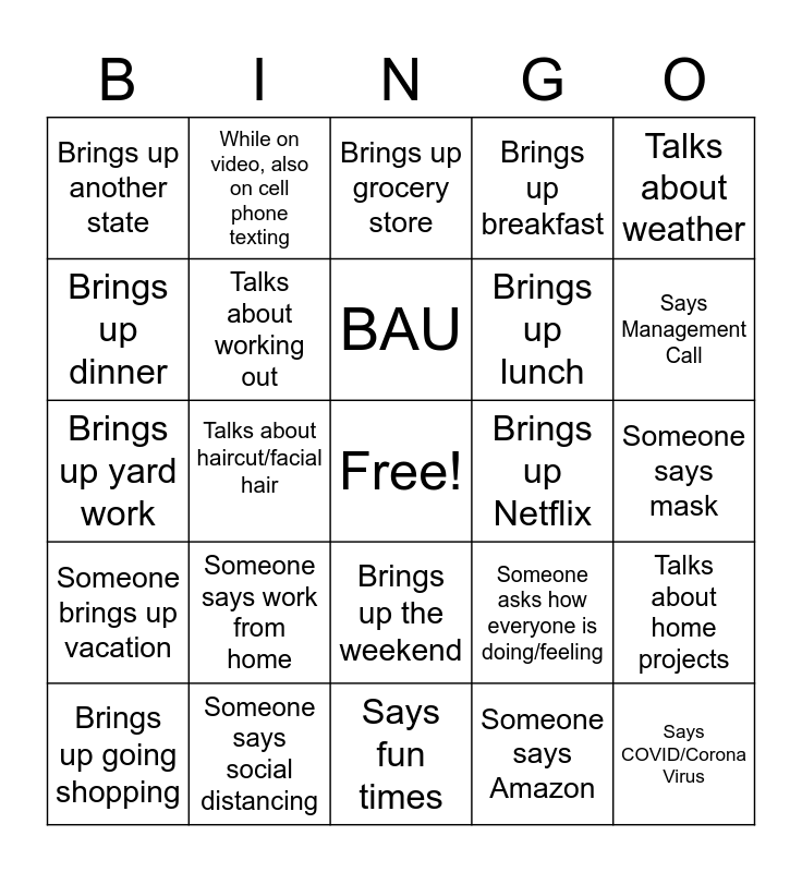 This bingo card has a free space and 32 words: Someone says Amazon, Someone is wearing a hat, Talks about haircut/facial hair, Someone is drinking coffee, Someone brings up vacation, Talks about working out, Talks about weather, Talks about home projects, While on video, also on cell phone texting, Brings up going out to eat, BAU, Brings up grocery store, Shows dog/animal on video, Kids join video, Brings up Netflix, Someones video goes out during call, Brings up going shopping, Brings up yard work, Brings up the weekend, Someone says work from home, Someone asks how everyone is doing/feeling, One of your meetings with Mgmt gets cancelled, Someone says mask, Someone says social distancing, Says COVID/Corona Virus, Brings up breakfast, Brings up lunch, Brings up dinner, Brings up another state, Says fun times, Says pandemic and Says Management Call.