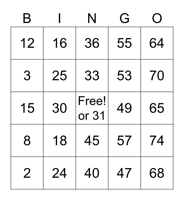 This bingo card has a free space and 24 words: 2, 18, 33, 47, 64, 12, 16, 36, 49, 65, 15, 25, 57, 74, 3, 24, 40, 55, 70, 8, 30, 45, 53 and 68.