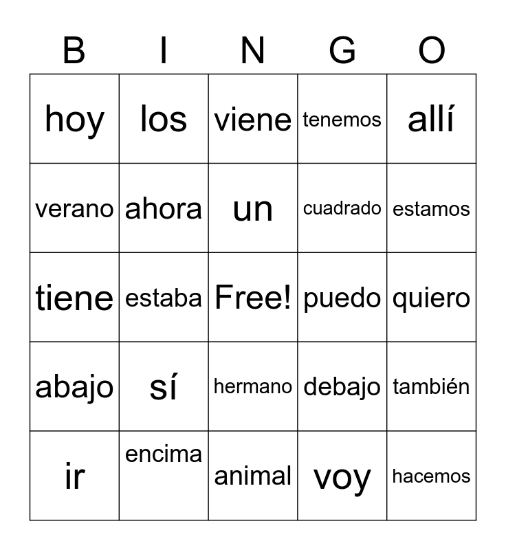This bingo card has a free space and 24 words: ir, sí, un, voy, allí, hoy, los, viene, puedo, quiero, tiene, ahora, debajo, también, verano, encima, animal, tenemos, estamos, abajo, estaba, hermano, cuadrado and hacemos.