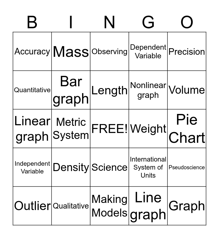 This bingo card has a free space and 24 words: Density, Qualitative, Length, Outlier, Precision, Accuracy, Quantitative, Mass, Weight, Science, Nonlinear graph, Linear graph, International System of Units, Pseudoscience, Bar graph, Line graph, Pie Chart, Observing, Volume, Metric System, Graph, Independent Variable, Dependent Variable and Making Models.