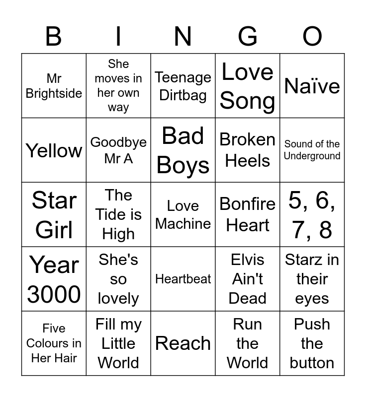 This bingo card has 25 words: She's so lovely, Reach, Bad Boys, Five Colours in Her Hair, Naïve, Mr Brightside, Yellow, She moves in her own way, Bonfire Heart, Heartbeat, Broken Heels, Star Girl, Elvis Ain't Dead, Starz in their eyes, Goodbye Mr A, Push the button, 5, 6, 7, 8, Teenage Dirtbag, Sound of the Underground, The Tide is High, Love Machine, Fill my Little World, Year 3000, Love Song and Run the World.