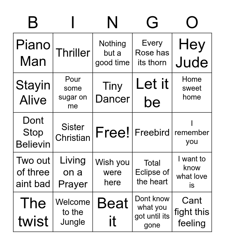This bingo card has a free space and 24 words: Living on a Prayer, Welcome to the Jungle, Tiny Dancer, The twist, Hey Jude, Piano Man, Stayin Alive, Thriller, Freebird, Wish you were here, Let it be, Dont Stop Believin, Total Eclipse of the heart, I want to know what love is, Pour some sugar on me, Dont know what you got until its gone, I remember you, Nothing but a good time, Home sweet home, Sister Christian, Cant fight this feeling, Two out of three aint bad, Every Rose has its thorn and Beat it.