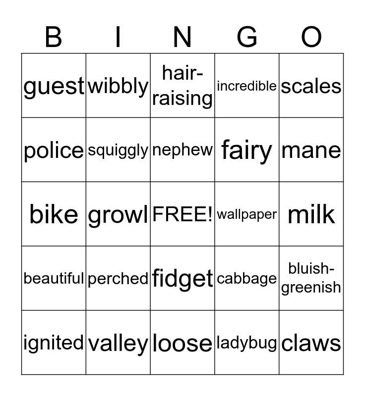This bingo card has a free space and 24 words: perched, valley, nephew, ignited, scales, guest, police, wibbly, wallpaper, fidget, fairy, bike, cabbage, bluish-greenish, squiggly, ladybug, milk, hair-raising, mane, growl, claws, beautiful, incredible and loose.