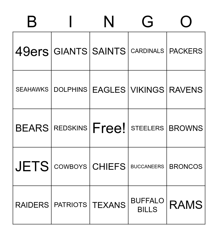 This bingo card has a free space and 24 words: COWBOYS, PATRIOTS, EAGLES, RAIDERS, PACKERS, 49ers, SEAHAWKS, GIANTS, STEELERS, CHIEFS, VIKINGS, BEARS, BUCCANEERS, BRONCOS, DOLPHINS, BUFFALO BILLS, BROWNS, SAINTS, RAVENS, REDSKINS, RAMS, JETS, CARDINALS and TEXANS.