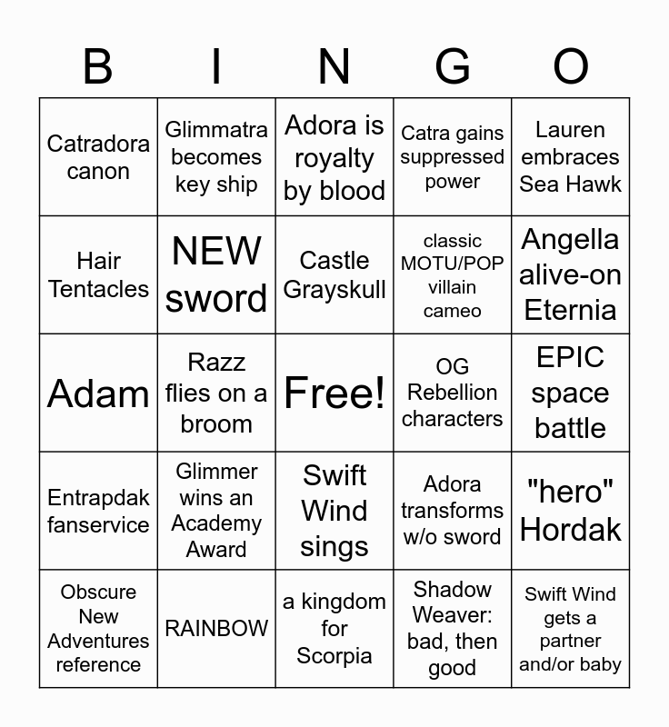 This bingo card has a free space and 24 words: Glimmer wins an Academy Award, RAINBOW, Castle Grayskull, Obscure New Adventures reference, Lauren embraces Sea Hawk, Catradora canon, Hair Tentacles, Glimmatra becomes key ship, OG Rebellion characters, Swift Wind sings, classic MOTU/POP villain cameo, Adam, Adora transforms w/o sword, "hero" Hordak, NEW sword, Shadow Weaver: bad, then good, EPIC space battle, Adora is royalty by blood, Angella alive-on Eternia, Razz flies on a broom, Swift Wind gets a partner and/or baby, Entrapdak fanservice, Catra gains suppressed power and a kingdom for Scorpia.