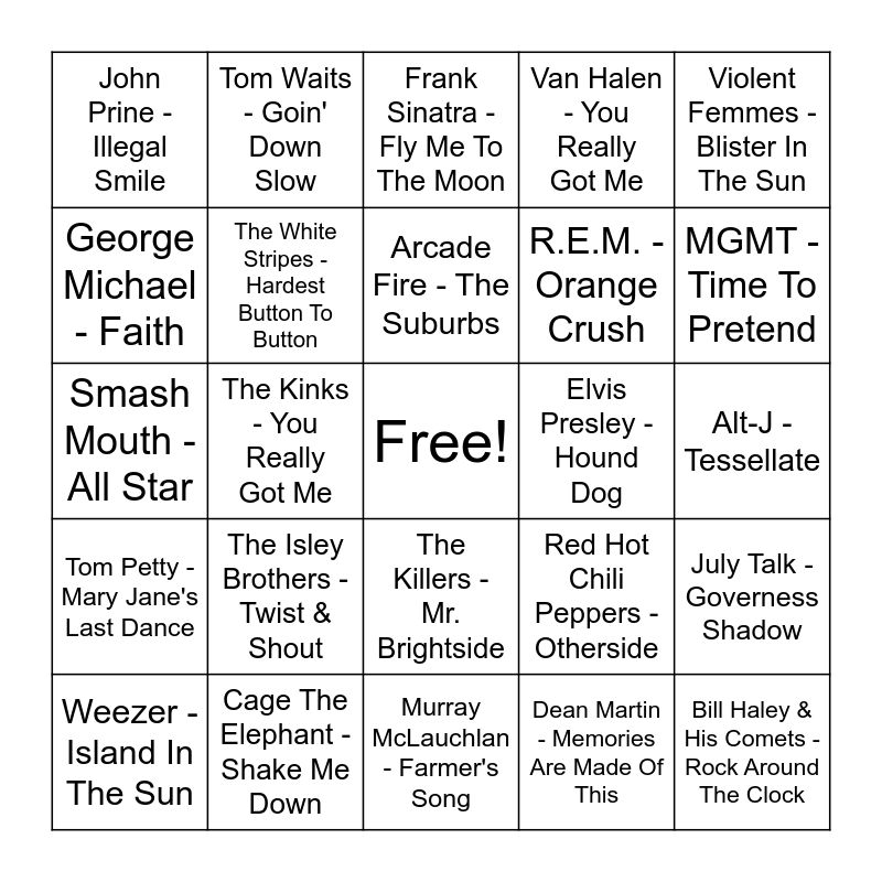 This bingo card has a free space and 36 words: Pixies - Where Is My Mind, Neil Young - Harvest Moon, The White Stripes - When I Hear My Name, The White Stripes - Hardest Button To Button, Red Hot Chili Peppers - Otherside, Tom Petty - Mary Jane's Last Dance, Arcade Fire - The Suburbs, Arcade Fire - Neighbourhood #1 (Tunnels), Violent Femmes - Blister In The Sun, Nirvana - About A Girl, The Kinks - You Really Got Me, Van Halen - You Really Got Me, Lead Belly - Where Did You Sleep Last Night, Elvis Presley - Hound Dog, MGMT - Time To Pretend, John Prine - Illegal Smile, The Clash - London Calling, The Isley Brothers - Twist & Shout, Bill Haley & His Comets - Rock Around The Clock, Frank Sinatra - Fly Me To The Moon, Alt-J - Tessellate, July Talk - Governess Shadow, Cage The Elephant - Shake Me Down, Weezer - Island In The Sun, Murray McLauchlan - Farmer's Song, Tom Waits - Goin' Down Slow, Smash Mouth - All Star, Dan Mangan - Jeopardy, R.E.M. - Orange Crush, George Michael - Faith, Bob Dylan - Rainy Day Women #12 & 35, Johnny Cash - I Walk The Line, Dean Martin - Memories Are Made Of This, The Killers - Mr. Brightside, Buffalo Springfield - For What It's Worth and The Band - Ophelia.