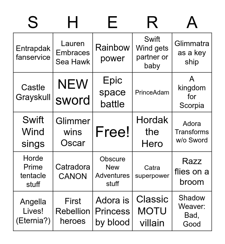 This bingo card has a free space and 24 words: Catradora CANON, First Rebellion heroes, Epic space battle, Angella Lives! (Eternia?), Glimmatra as a key ship, Entrapdak fanservice, Castle Grayskull, Lauren Embraces Sea Hawk, Hordak the Hero, Obscure New Adventures stuff, PrinceAdam, Swift Wind sings, Catra superpower, Razz flies on a broom, NEW sword, Classic MOTU villain, Adora Transforms w/o Sword, Rainbow power, A kingdom for Scorpia, Glimmer wins Oscar, Shadow Weaver: Bad, Good, Horde Prime tentacle stuff, Swift Wind gets partner or baby and Adora is Princess by blood.