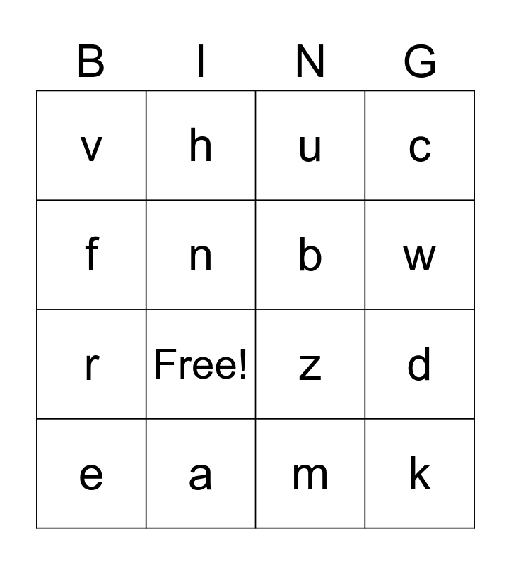 This bingo card has 16 words: a, d, u, v, r, h, z, m, f, n, e, c, Free!, w, b and k.