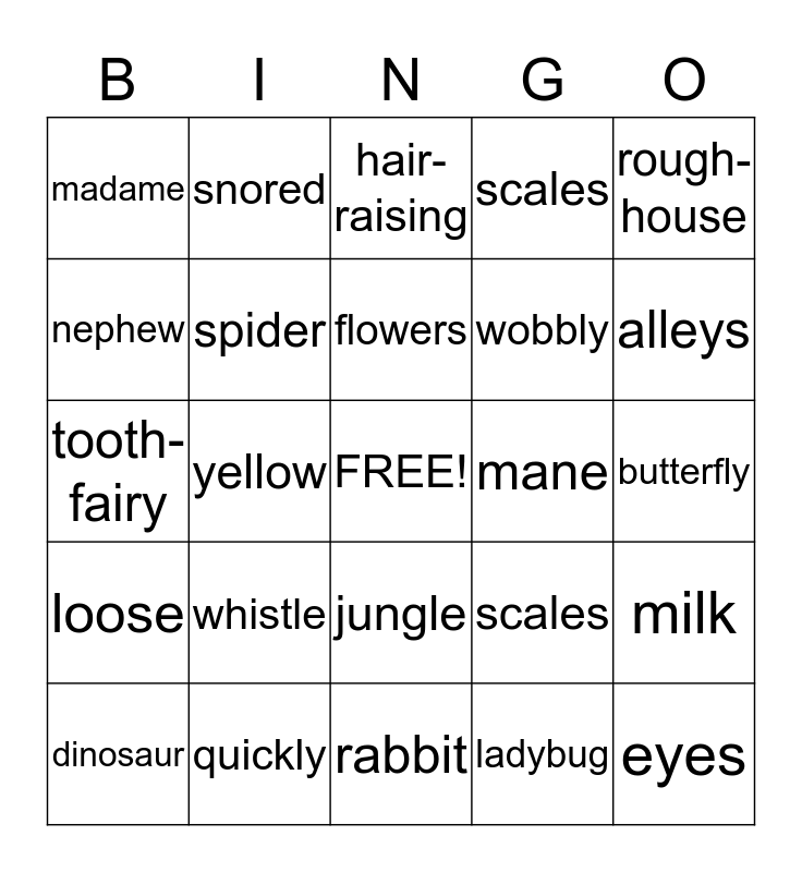 This bingo card has a free space and 24 words: whistle, quickly, flowers, dinosaur, rough- house, madame, nephew, snored, mane, jungle, wobbly, tooth-fairy, scales, milk, spider, ladybug, butterfly, hair-raising, alleys, yellow, eyes, loose, scales and rabbit.