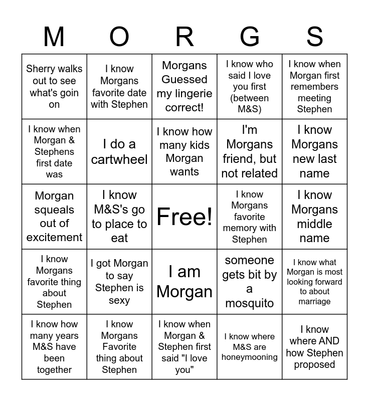 This bingo card has a free space and 29 words: I know how many years M&S have been together, I know M&S's favorite hang out spot, I know M&S's go to place to eat, Alan walks out and makes a joke, Sherry walks out to see what's goin on, Morgans Guessed my lingerie correct!, I do a cartwheel, I got Morgan to say Stephen is sexy, I know Morgans favorite memory with Stephen, I know Morgans Favorite thing about Stephen, I know Morgans middle name, I know where AND how Stephen proposed, I know when Morgan & Stephen first said "I love you", I know where M&S are honeymooning, I know Morgans new last name, I know what Morgan and Stephens first date was, I am Morgan, I know Morgans favorite thing about Stephen, I know when Morgan first remembers meeting Stephen, Morgan squeals out of excitement, someone gets bit by a mosquito, I'm related to Morgan, I'm Morgans friend, but not related, I know when Morgan & Stephens first date was, I know who said I love you first (between M&S), I know Morgans favorite date with Stephen, I know what Morgan is most looking forward to about marriage, I know how many kids Morgan wants and I'm desperate for a second FREE space.