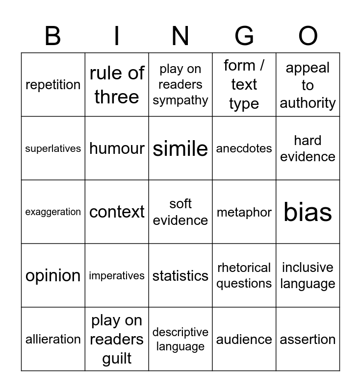 This bingo card has 25 words: imperatives, descriptive language, simile, allieration, appeal to authority, repetition, superlatives, rule of three, metaphor, statistics, anecdotes, exaggeration, rhetorical questions, inclusive language, humour, assertion, bias, play on readers sympathy, hard evidence, context, soft evidence, play on readers guilt, opinion, form / text type and audience.