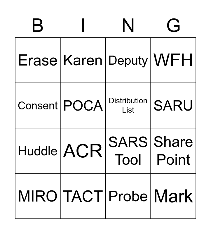 This bingo card has 23 words: Mark, Victim, SARU, Fast Track, Consent, Erase, POCA, Karen, MIRO, DAML, ACR, Huddle, Candy Man, Carl, TACT, Buffet, Deputy, SARS Tool, Distribution List, Share Point, WFH, Probe and Tax Evasion.