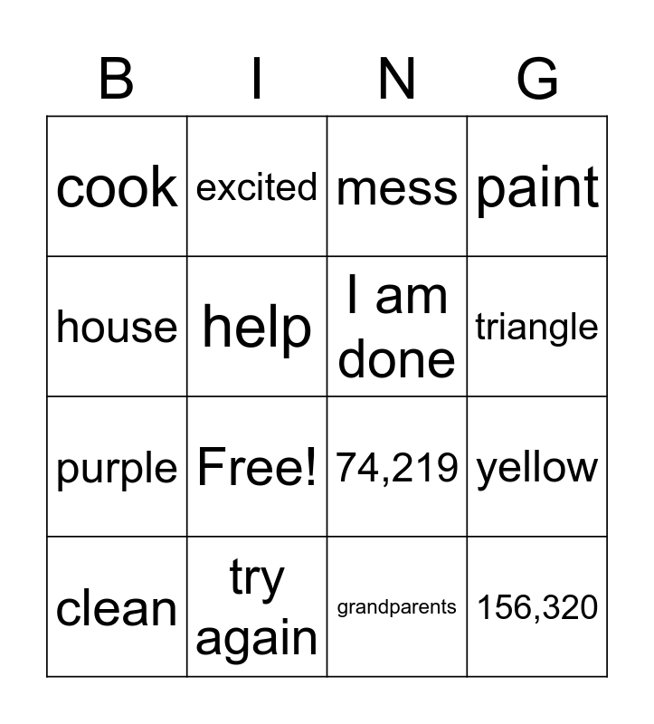 This bingo card has 16 words: try again, yellow, mess, cook, purple, excited, 74,219, grandparents, house, help, clean, paint, Free!, triangle, I am done and 156,320.