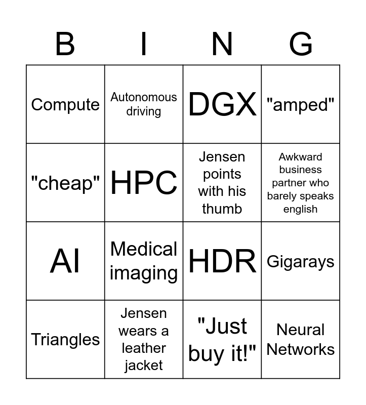 This bingo card has 16 words: Jensen wears a leather jacket, Gigarays, DGX, Compute, AI, Autonomous driving, HDR, "Just buy it!", "cheap", HPC, Triangles, "amped", Medical imaging, Awkward business partner who barely speaks english, Jensen points with his thumb and Neural Networks.