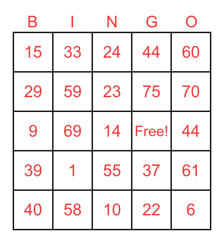 This bingo card has 25 words: 1, 10, 23, 40, 60, 15, 29, 33, Free!, 55, 75, 9, 37, 61, 59, 6, 44, 24, 70, 69, 14, 58, 39, 44 and 22.