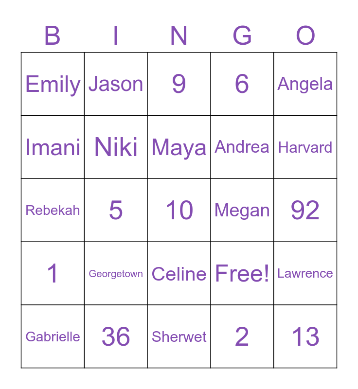This bingo card has 25 words: Georgetown, Sherwet, Maya, Gabrielle, Angela, Emily, Imani, Jason, Megan, Celine, Andrea, Rebekah, Free!, Lawrence, Niki, 13, 92, 9, Harvard, 5, 10, 36, 1, 6 and 2.