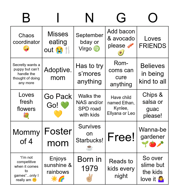 This bingo card has 25 words: Foster mom, Born in 1979 ✌🏼, Has to try s’mores anything, “I’m not competitive when it comes to games”...only I really am 🤫, Loves FRIENDS, Chaos coordinator 🤪, Secretly wants a puppy but can’t handle the thought of doing any more, Misses eating out 😭🍴, Have child named Ethan, Kynlee, Ellyana or Leo, Survives on Starbucks! ☕️, Rom-coms can cure anything, Loves fresh flowers 💐, Free!, Wanna-be gardener 🌱🍅🥕, Adoptive. mom, So over slime but the kids love it 🤷♀️, Chips & salsa or guac please!, September bday or Virgo ♍️, Believes in being kind to all, Go Pack Go! 💚💛, Walks the NAS and/or SPD road with kids, Enjoys sunshine & rainbows ☀️🌈, Mommy of 4, Add bacon & avocado please 🥓🥑 and Reads to kids every night.