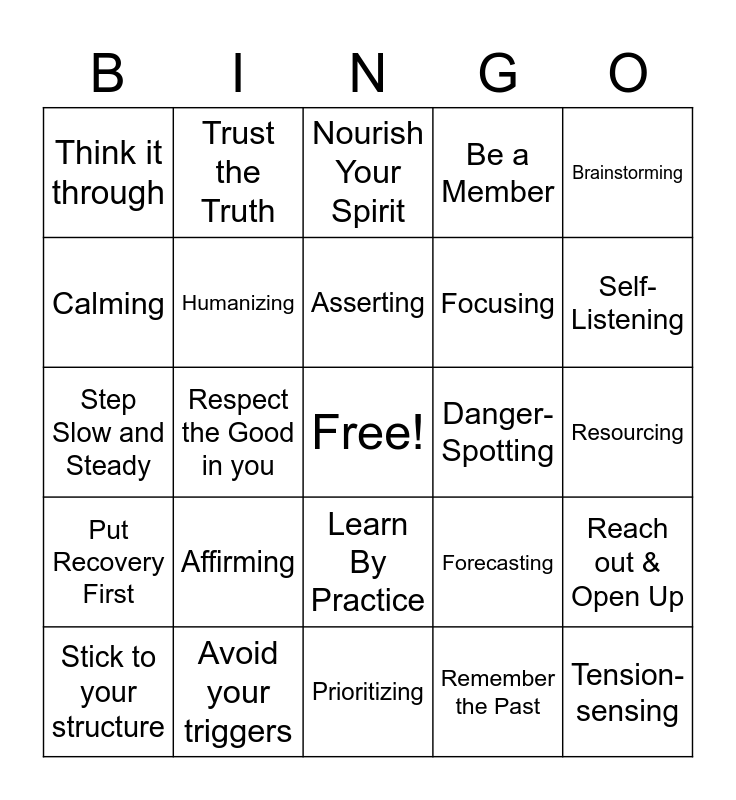 This bingo card has a free space and 24 words: Affirming, Avoid your triggers, Asserting, Stick to your structure, Brainstorming, Think it through, Calming, Trust the Truth, Danger-Spotting, Learn By Practice, Focusing, Step Slow and Steady, Forecasting, Reach out & Open Up, Humanizing, Remember the Past, Resourcing, Nourish Your Spirit, Self-Listening, Respect the Good in you, Tension-sensing, Put Recovery First, Be a Member and Prioritizing.