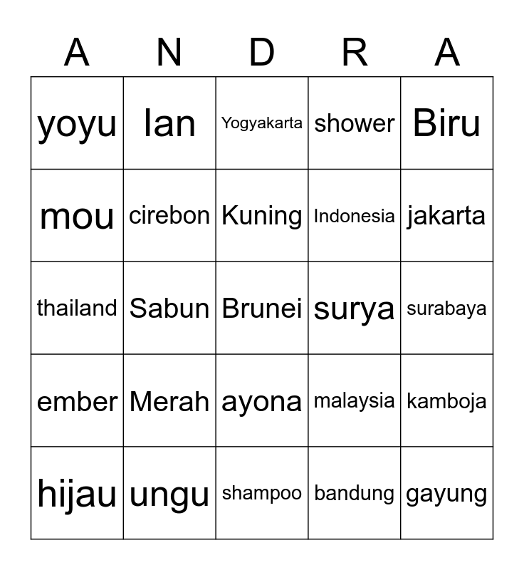 This bingo card has a free space and 24 words: Merah, ungu, Kuning, hijau, Biru, yoyu, mou, Ian, surya, ayona, Indonesia, thailand, malaysia, kamboja, cirebon, bandung, surabaya, Yogyakarta, jakarta, Sabun, gayung, ember, shower and shampoo.