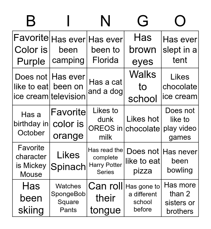 This bingo card has a free space and 24 words: Likes Spinach, Watches SpongeBob Square Pants, Has a cat and a dog, Has been skiing, Has ever slept in a tent, Favorite Color is Purple, Does not like to eat ice cream, Has ever been camping, Likes hot chocolate, Has read the complete Harry Potter Series, Walks to school, Has a birthday in October, Does not like to eat pizza, Has never been bowling, Has ever been on television, Has gone to a different school before, Does not like to play video games, Has ever been to Florida, Likes chocolate ice cream, Favorite color is orange, Has more than 2 sisters or brothers, Favorite character is Mickey Mouse, Has brown eyes and Can roll their tongue.