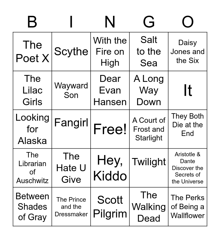 This bingo card has a free space and 24 words: The Hate U Give, The Prince and the Dressmaker, Dear Evan Hansen, Between Shades of Gray, Daisy Jones and the Six, The Poet X, The Lilac Girls, Scythe, A Court of Frost and Starlight, Hey, Kiddo, A Long Way Down, Looking for Alaska, Twilight, Aristotle & Dante Discover the Secrets of the Universe, Wayward Son, The Walking Dead, They Both Die at the End, With the Fire on High, It, Fangirl, The Perks of Being a Wallflower, The Librarian of Auschwitz, Salt to the Sea and Scott Pilgrim.