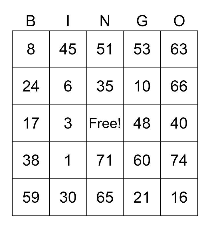 This bingo card has a free space and 24 words: 1, 30, 35, 59, 63, 8, 24, 45, 48, 71, 10, 17, 60, 74, 6, 21, 40, 51, 66, 3, 16, 38, 53 and 65.